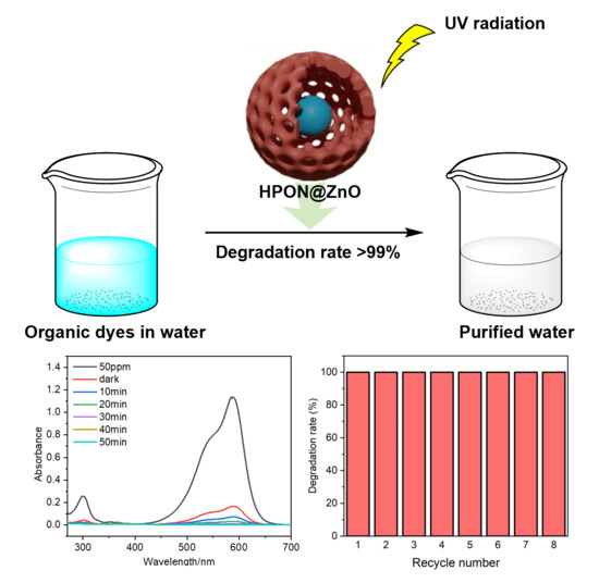 Currently, various wastewater treatment methods have been explored for removal of dyes from wastewater, including biological treatment [2], chemical coagulation [3], chemical oxidation [4,5], adsorption [6,7], electrochemical methods [8,9], and photocatalysis. Photocatalysis has been proven to be a promising method for the treatment of dye wastewater with superior operational conditions, low cost, and high efficiency. Based on the in situ generation of highly reactive transient species (i.e., .OH and .O2−) in the photocatalysis progress, dyes can be degraded and mineralized into CO2 and H2O [10]. So, there are few secondary pollutants generated in photocatalysis without further treatment [11]. Since the Honda–Fujishima effect with TiO2 photoelectrodes was first reported in 1972, numerous breakthroughs have been achieved in developing new semiconductor photocatalysts for various photocatalytic applications [12]. To date, multiphase photocatalytic reduction and oxidation based on semiconductors and solar energy have attracted extensive attention in various fields, such as energy, materials, the environment, and chemistry. Currently, zinc oxide (ZnO) is widely used in the fields of photocatalysis [13,14,15], thermocatalysis [16,17], and electrocatalysis [18,19,20]. Additionally, it has broad application prospects in the fields of antibacterial [21,22,23] and antioxidant agents [24,25,26]. For example, Yi and co-workers reported a silver-modified ZnO nanocatalyst for photocatalytic oxidation of methane [27]. Nanoscale ZnO exhibited high activity for methane oxidation under simulated sunlight, and nano silver decorations further improve the photocatalytic activity via the surface plasmon resonance, even under visible light illumination. Song and partners reported on ZnO-Cu(I) hybrid nanoparticles in aqueous media that converted carbon dioxide into methane with a selectivity of up to 99% [28]. Ansari et al. explored the construction of carbon-doped ZnO by a new furfural complexation method, and the synthesized ZnO photocatalyst showed excellent catalytic activity in the degradation of Rhodamine B [29]. Olga Osmolovskaya and her team synthesized core-shell ZnO nanoparticles combined with Fe3O4, which featured magnetic separability and exhibited good photocatalytic activity in the degradation of Naphthol Green B [30]. To date, ZnO-based composites have been extensively studied for dye photodegradation because of their nontoxicity, chemical stability, and abundant availability [31,32]. However, high surface energy facilitates the aggregation of ZnO nanoparticles during the photocatalysis process, which consequently restricts the photocatalytic activity and hinders the practical application of photocatalysts owing to their poor stability and reusability [33,34,35]. The immobilization of ZnO nanoparticles on suitable substrates is an effective strategy for constructing ZnO photocatalysts with high efficiency and good stability. Porous organic polymers have attracted considerable interest as substrates for heterogeneous catalysts due to their high specific surface areas, abundant porous configurations, and excellent structural designability. Therefore, the immobilization of ZnO on porous organic polymers facilitates the high dispersion of ZnO nanoparticles in ZnO-based composites, which further improves the structural stability of the photocatalysts. Furthermore, hierarchical meso/micropores and the high surface area of the supports is crucial for mass transmission in ZnO-based composites and the accessibility of the ZnO active sites to achieve the effective photodegradation of dyes. Hence, an exploration of porous polymer-supported ZnO composites is necessary for the effective degradation of dyes.