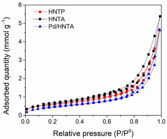 The specific area calculated from the BET method for HNTA was 50 m2 g−1, with an average pore diameter of 13.5 nm determined by the BJH method, and a total pore volume of 0.16 cm3 g−1. The textural properties of Pd/HNTA were similar to those of the support, displaying a decrease in SBET of 35 m2 g−1 and an average pore diameter of 11.5 nm, which is attributed to the incorporation of Pd-NPs on the inner surface of the support. A similar trend for Pd/HNT catalysts was detected (Figure S1 in Supplementary Materials).