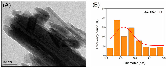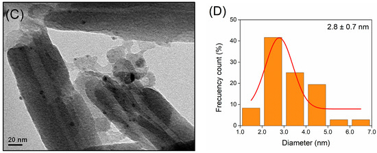 The morphology of the HNTA nanomaterial was confirmed by TEM, which showed well-defined tubular structures with an average length of 130 ± 3 nm and an external diameter of 47 ± 1 nm, demonstrating that organo-functionalization did not change the original morphology of the nanomaterial (Figure S2 in Supplementary Materials). The TEM micrograph of the Pd/HNTP catalyst (Figure 3A) shows a spherical Pd-NP distribution within the tubular structure, that is, on both the inner and outer surfaces of the supports with a mean particle size of 2.8 ± 0.8 nm. However, the Pd/HNTA catalysts contained Pd-NPs dispersed mainly on the inner surface of the HNTA support with a mean particle size of 2.2 ± 0.4 nm. (Figure 3B). The average particle sizes were then determined, and a dispersion (DPd) of approximately 41% was obtained for Pd/HNTP and 32% for the Pd/HNTA catalytic systems. The inner surface functionalization of the support via the introduction of amine functional groups improves metal dispersion, thereby tuning the catalytic properties.