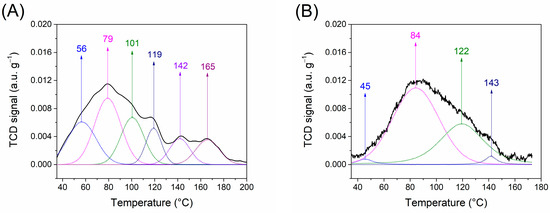 On the other hand, the TPD-H2 profiles were obtained and analyzed to reveal the H2 chemisorption behavior on the Pd/HNTP and Pd/HNTA catalysts, as displayed in Figure 4. The corresponding TPD-H2 showed wide desorption peaks for both catalysts at temperatures ranging from 25 to 200 °C. For the Pd/HNTP system, the signal was deconvoluted in six contributions with the maximum rate of desorption at a temperature of about 79 °C. The presence of these peaks in the thermogram indicates that several adsorption states exist, which is the result of the occurrence of different adsorption centers with specific bond strengths of hydrogen (Figure 4A). The low temperature (<100 °C) of the maximum rate of desorption indicates that moderate bound hydrogen exists on the surface of the Pd/HNTP catalyst, while the Pd-NP size distribution is a consequence of the different deconvoluted contributions in the DTP-H2 profile [37,38]. The addition of the amine-functional group on the HNT lumen changes hydrogen desorption for the Pd/HNTA catalyst (Figure 4B). This system displayed a displacement in the size of desorption peaks, deconvoluted signals, and temperatures, which means that the amount of sorbed hydrogen on the Pd/HNTA system increases in comparison with the Pd/HNTP catalyst. The peak of the maximum rate of desorption at the temperature of about 79 °C for the Pd/HNTP catalysts displaced to 84 °C in the case of Pd/HNTA, whereas the deconvoluted contributions in the TPD-H2 profile decreased from six to four, respectively. This trend is attributed to the effect of organic functionalization, which generates a homogeneous metallic dispersion and narrow Pd-NP size distribution in the Pd/HNTA catalyst. In addition, the interaction of H2 on the surface of Pd-NPs can be the reason for the different activity of the Pd/HNTP and Pd/HNTA catalyst in the hydrogenation reactions (vida infra).