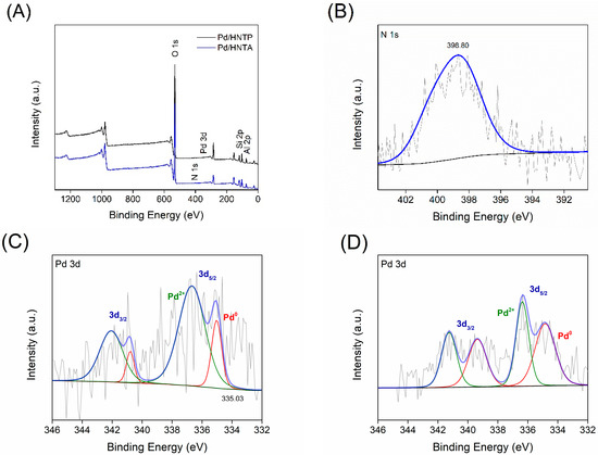 (A) Survey XPS spectrum for the as-synthesized catalysts, (B) high-resolution N 1s XPS spectrum for Pd/HNTA, (C) high-resolution Pd 3d XPS spectrum for the Pd/HNTP, and (D) high-resolution Pd 3d XPS spectrum for the Pd/HNTA.