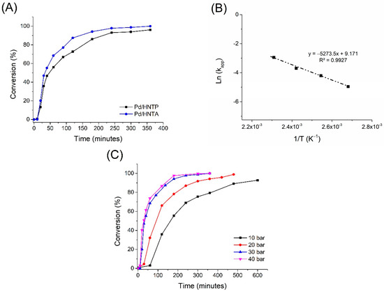 Catalytic data for NB hydrogenation. (A) NB conversion, (B) Arrhenius plot for Pd/HNTA, and (C) effect of H2 pressure for Pd/HNTA. Mass catalysts: 0.025 g, 50 mL of ethanol, and a stirring speed of 700 rpm.