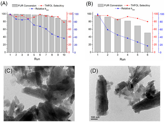 Recyclability of the catalysts for FUR hydrogenation at 360 min; (A) recycles for Pd/HNTA, (B) post-reaction TEM characterization of Pd/HNTA, (C) recycles for Pd/HNTP, and (D) post-reaction TEM characterization of Pd/HNTP. Reaction conditions: mass catalysts 0.025 g, 30 bar H2 pressure, 120 °C, 50 mL of n-dodecane, and stirring speed of 700 rpm.