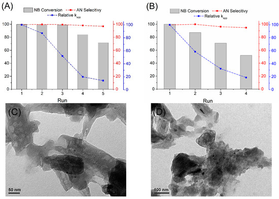 Recyclability of the catalysts for the hydrogenation of NB at 6 h; (A) recycles for Pd/HNTA, (B) post-reaction TEM characterization of Pd/HNTA, (C) recycles for Pd/HNTP, and (D) post-reaction TEM characterization of Pd/HNTP. Reaction conditions: mass catalysts 0.025 g, 10 bar H2 pressure, 30 °C, 50 mL of ethanol, and stirring speed of 700 rpm.