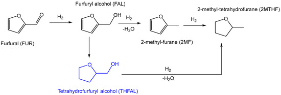 - Huang, R.; Cui, Q.; Yuan, Q.; Wu, H.; Guan, Y.; Wu, P. Total Hydrogenation of Furfural over Pd/Al2O3 and Ru/ZrO2 Mixture under Mild Conditions: Essential Role of Tetrahydrofurfural as an Intermediate and Support Effect. ACS Sustain. Chem. Eng. 2018, 6, 6957–6964. [Google Scholar] [CrossRef]