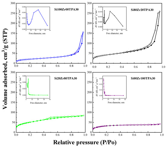 Figure 1 shows the adsorption–desorption isotherms and pore diameter distribution of SiXZrYTPA30 materials, and the key textural property data summarized in Table 1. The isotherms can be classified (according to IUPAC) as type IV, characteristic of mesoporous materials.
