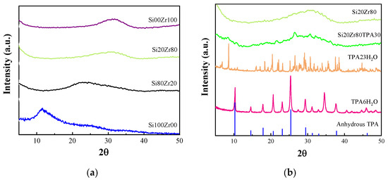 (a) XDR patterns of SiXZrY; (b) XDR patterns of Si20Zr80TPA30, Si20Zr80 sample, TPA hydrated with 6 and 23 molecules, and anhydrous TPA (JCPDS No 50 0657).