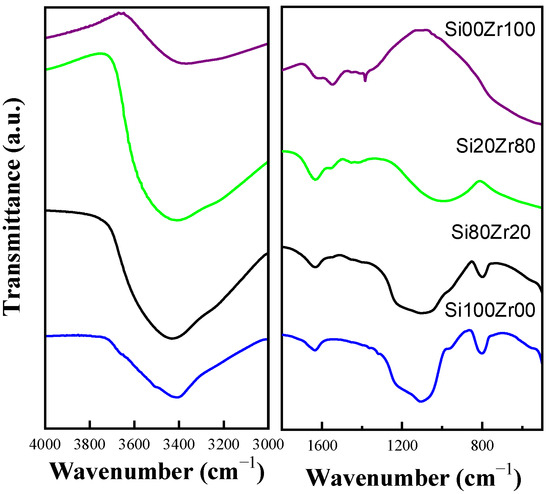 The Si00Zr100 spectrum reveals a broad band associated with the stretching vibrations of the -OH group (3600 and 3200 cm−1), as well as a pair of non-coincident bands with maxima at 1620 cm−1 and 1550 cm−1, assigned to the bending vibrations of (H-O-H) and (O–H–O), respectively [22]. Additionally, another broad band extending from 1060 cm−1 to 400 cm−1 is observed, which is characteristic of zirconia bonds.