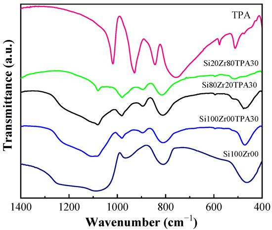 FT-IR characteristic bands of TPA, SiO2, ZrO2, and TEA materials.