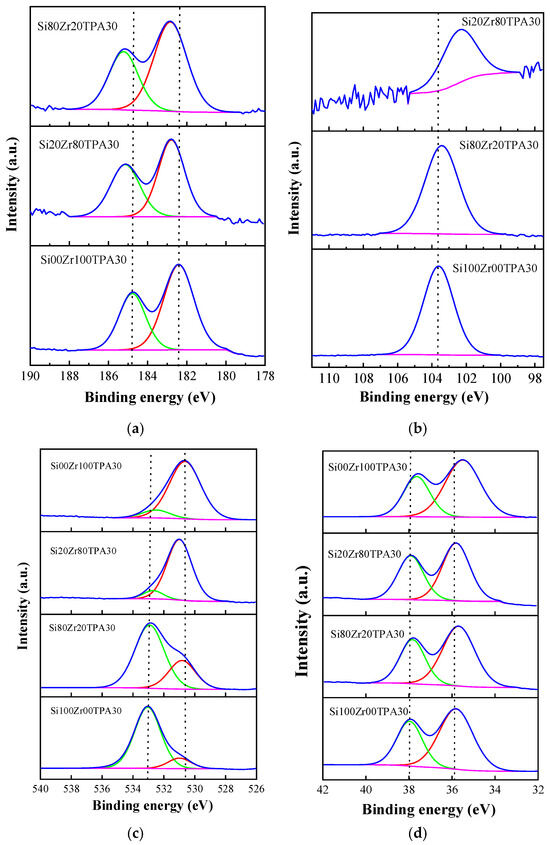 Figure 5b shows the spectra of Si 2p along with their corresponding deconvolution, for the materials Si100Zr00TPA30, Si80Zr20TPA30, and Si20Zr80TPA30. The Si100Zr00TPA30 sample exhibits a peak at a binding energy of 103.6 eV, which, according to the literature, corresponds to the presence of silicon oxide in a tetrahedral structure [29,45]. In the case of samples containing Zr, a shift towards lower binding energies between 103.4 and 102.3 eV is evident. This shift increases as the Si/Zr ratio decreases, and is attributed to the formation of Si-O-Zr bonds [29]. As mentioned before, the electronegativity of Si is greater than that of Zr, therefore the Si electron cloud increases and the Si 2p binding energy decreases. Considering the small electronegativity difference between Si and W, the influence of W-O-Si covalent bonds formed during the thermal treatment over the Si 2p binding energy shift can be considered negligible. No evidence was found for the signals corresponding to Si(-OH)X that appear at energy values equal to 99.5 eV [46].