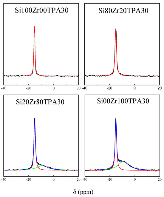 An analogous behavior was suggested for the interaction of TPA with ZrO2, SiO2, and TiO2 [50,53,54]. For materials with lower SiO2 proportion (Si20Zr80TPA30 and Si00Zr100TPA30 samples), the additional presence of a shoulder at ~9 ppm, which is assigned to the [PW11O39]7− anion, was detected [55]. Moreover, its intensity increased with the increment of ZrO2 content in the sample.