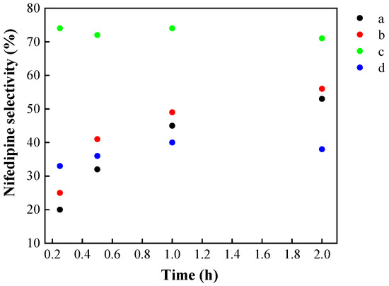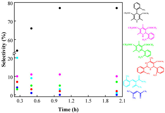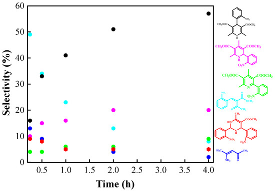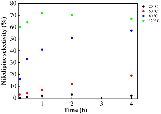 In recent decades, it has been found that reaction conditions and catalyst type can alter the selectivity towards 1,4-dihydropyridine. However, no detailed study applied to the synthesis of nifedipine has been reported. 2-Phenylpyridine (the unsymmetrical 1,2-DHP) can be obtained as the main product under various conditions, for example, room temperature and long time periods [59], alumina-supported HPA [60], Mn and Ce oxides [15], and gold catalyst [61].