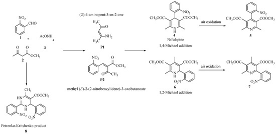 Nifedipine 4 (Scheme 2) is obtained as the main product under heating conditions and using an acid catalyst for a long time. The reaction proceeds via 1,4-addition (Michael-type), in which C-C bond formation is thermodynamically favorable and can occur under either basic conditions or using acidic catalysts [57,58].