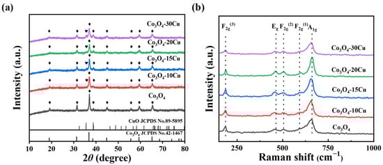 (a) XRD patterns and (b) Raman spectra of CuO and Co3O4-XCu.