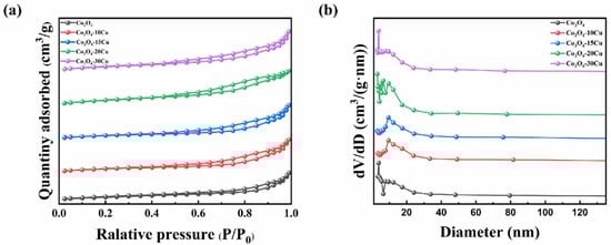 Elemental compositions of the samples were analyzed using ICP-OES. The molar ratios of Co and Cu in the samples are shown in Table 1, and it is found that the molar proportion of Cu were 0.10, 0.15, 0.20, and 0.29, respectively. It means that Cu was successfully added to the Co3O4 catalysts, as required. The structural properties of the catalysts were analyzed through N2 adsorption–desorption isotherms as shown in Figure 2. All the samples display type III isotherms and H3-type hysteresis loop [26]. This indicates that the series of catalysts possess mesoporous structures; however, their pore structures are not highly ordered or uniform. The specific surface area of pure Co3O4 is only 15.86 m2/g. When CuO is introduced, the specific surface area and pore volume of the samples become larger, especially when the contents of CuO is 20%, the sample has the largest specific surface area of 27.49 m2/g, which enable the samples adsorb more gas phase molecules to make the catalytic oxidation reaction occur [27].