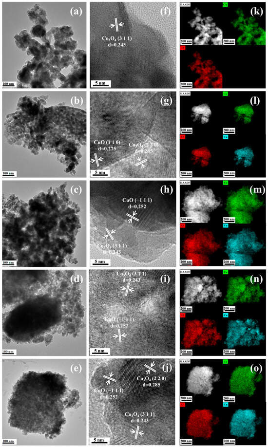 TEM images of (a) Co3O4, (b) Co3O4-10Cu, (c) Co3O4-15Cu, (d) Co3O4-20Cu, (e) Co3O4-30Cu; HRTEM images of (f) Co3O4, (g) Co3O4-10Cu, (h) Co3O4-15Cu, (i) Co3O4-20Cu, (j) Co3O4-30Cu; element mapping images of (k) Co3O4, (l) Co3O4-10Cu, (m) Co3O4-15Cu, (n) Co3O4-20Cu, (o) Co3O4-30Cu.