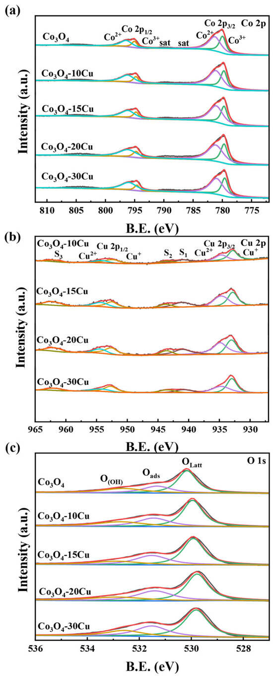 Raman spectroscopy was utilized to examine the structural distortions. Figure 1b shows the Raman spectra of Co3O4 and Co3O4-XCu samples with varying CuO contents. For Co3O4, five different Raman bands (A1g, Eg, 3F2g) can be observed at 186, 462, 504, 591 and 660 cm−1. Among these, the peak observed at 660 cm−1 is associated with the octahedral CoO6 site, exhibiting A1g symmetry pattern [21], and the peaks at 462, 504 and 186 cm−1 belong to the Eg, F2g(2) and F3g(3) patterns [22,23], while the peak at 591 cm−1 is attributed to the tetrahedral CoO4 site with an F2g(1) pattern [21]. CuO exhibits a characteristic peak at 282 cm−1 [24]; however, it is not observed in the spectra of Co3O4-XCu, perhaps due to the relatively low contents and high dispersity. When CuO is doped, the Co3O4 structure changes due to residual stress or lattice deformation (including lattice defects). And the strong interaction between Co3O4 and CuO will lead to a large degree of lattice defects [25], which subsequently enhances the formation of oxygen vacancies and also facilitates the catalytic oxidation reaction. This was combined with the phenomenon in XRD that the intensity of the signal peak decreased and the half-peak width increased with the doping of Cu (Supplementary Table S2).