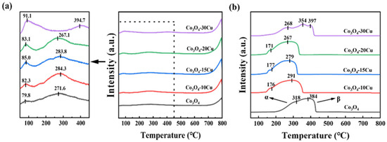 The reducibility performance of the catalyst is a key factor affecting the catalytic oxidation properties of ethyl acetate, and in order to further understand the redox capacity of the catalyst, Co3O4-XCu were tested for H2-TPR. As displayed in Figure 5b, H2-TPR peaks of pure Co3O4 appear at 318 and 384 °C, representing the reduction in Co3+→Co2+ and Co2+→Co0 [38,39]. According to the literature, pure CuO shows a peak at around 310 °C, corresponding to the reduction in CuO [40]. Compared with pure Co3O4 and CuO, when the appropriate amount of CuO is added into Co3O4, the reduction peaks (α and β) of Co3O4-XCu is moved to lower temperature, and there is an overlap between the reduction peaks. It is shown that the appropriate introduction of CuO can enhance the low-temperature reducibility of the catalyst. Compared with the other samples, the initial reduction temperature is the lowest for Co3O4-20Cu. It is suggested that the proper introduction of Cu can help to form more structural defects and enhance the interaction between Co and Cu, which reaches the strongest when the amount of Cu is 20%. The existence of Cu+ and Cu2+ also promotes the production of more Co2+ in the catalyst and enhances the reduction ability [41]. Moreover, the improvement of low-temperature reduction and oxygen mobility facilitates the cyclic replenishment of oxygen vacancies throughout the reaction [42]. Considering the oxygen mobility and reduction at low temperature, Co3O4-20Cu exhibits superior catalytic performance for ethyl acetate degradation among all samples [36].