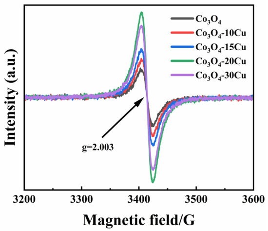 We verified the abundance of oxygen vacancies in the samples by performing EPR on Co3O4 and Co3O4-XCu. As displayed in Figure 6, all the samples have a signal with a g-value of 2.003 [43]. Compared to the other Co3O4-XCu samples, Co3O4-20Cu exhibits much higher signal intensity, which indicates more oxygen vacancies existing in it. Furthermore, the oxygen vacancies concentration follows the order: Co3O4-20Cu > Co3O4-30Cu > Co3O4-15Cu > Co3O4-10Cu > Co3O4. The rich oxygen vacancy of Co3O4-20Cu is possible one of the reasons for its excellent catalytic activities [44].