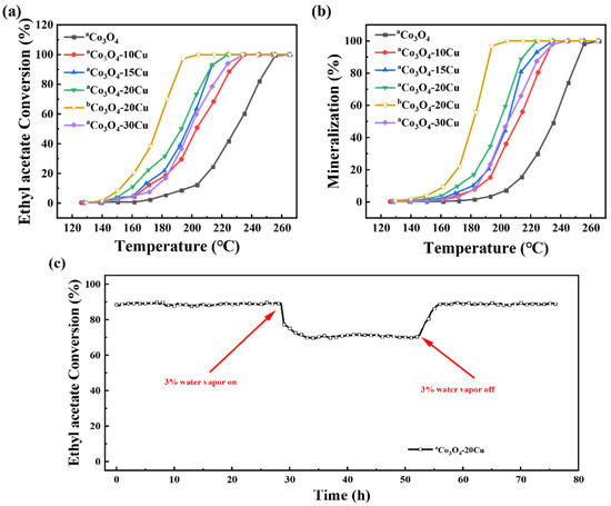 The catalytic performance of catalysts for ethyl acetate degradation was tested, and the results are shown in Figure 7. Co3O4 exhibits T50 and T90 for ethyl acetate conversion at 229 and 250 °C, and the corresponding temperature for 90% mineralization is 253 °C. When CuO is introduced into Co3O4, the catalysts show much better activity. From Table 3, it can be observed that the catalytic activity for the oxidation of ethyl acetate follows the order: Co3O4-20Cu > Co3O4-15Cu > Co3O4-30Cu > Co3O4-10Cu > Co3O4. Among these, Co3O4-20Cu exhibits the best catalytic performance, achieving T50 and T90 for conversion temperatures of 193 and 211 °C, respectively, and T90 for mineralization at 214 °C. The results demonstrate that, appropriate addition of CuO can significantly enhance the catalytic activity of the catalyst. Figure 7 illustrates that the catalytic activity first increases and subsequently decreases with the rise in CuO content. The optimal CuO doping amount was determined to be 20%. Supplementary Table S3 shows the activity of catalysts for EA degradation, from that we can see, our catalyst Co3O4-20Cu exhibits certain advantages in comparison to the noble metal free catalysts in the similar conditions. The stability of catalytic activity is a crucial metric for assessing the catalytic performance of catalysts. Among them, the stability of Co3O4-20Cu in ethyl acetate oxidation was evaluated by long-term stability test. As shown in Figure 7c, at WHSV = 60,000 mL/(g·h) and 1000 ppm concentration of ethyl acetate gas, the conversion rate of ethyl acetate at 218 °C (~90%) is not change over 24 h, which indicates the good stability of Co3O4-20Cu. Furthermore, to judge the stability of the catalyst Co3O4-20Cu, an 80-h stability test was performed, during which 3% water vapor was introduced into the reaction gas to evaluate the catalyst’s resistance to water vapor. As shown in Figure 7c, at 218 °C, the reaction is initially maintained at 90% conversion for 24 h, then an additional 3% water vapor is added into the ethyl acetate gas flow. Subsequently, the conversion drops to 70% and remains stable, after additional 24 h, the water vapor is removed, the conversion rate of the catalyst recovered to 90%. This suggests that the decrease in catalyst activity by the introduction of water vapor may be attributed to competitive adsorption of water on the catalyst surface, significantly, this effect is reversible. The results show that the Co3O4-20Cu catalyst demonstrates resilience against the adverse effects of water vapor. The catalytic activity may be reactive after the water vapor was removed.
