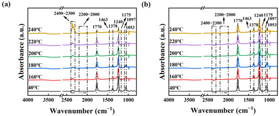 To further investigate the mechanism of ethyl acetate catalytic oxidation, we conducted in situ DRIFTS tests on Co3O4-20Cu. Figure 8a shows the analysis of the intermediates produced during the catalytic oxidation of ethyl acetate on the surface of the Co3O4-20Cu catalyst from 40 to 240 °C. At 40 °C in air, ethyl acetate is firstly introduced for 10 min, four absorption bands at 1770, 1378, 1240 and 1053 cm−1 bands belong to the bending vibration of C=O, CH3(CO), C=O in C-O group and C-O-C on the samples present, which are the characteristic peak of ethyl acetate. [45]. Then, the samples are gradually heated up to 240 °C. As the temperature increases, the intensity of characteristic peaks decreases or the peaks disappear obviously. Other signals appear simultaneously, in which the 2400–2300 cm−1 band is the C-O stretching vibration of CO2 [46], the 2200–2000 cm−1 band is the C-O stretching vibration of CO [47], the 1463 cm−1 band is the COO- stretching vibration [18], the 1175 cm−1 band is the characteristic peak of acetic acid [48], and the 1097 m−1 band is the C-O stretching vibration of ethanol [49]. According to Figure 8a, it can be speculated that after ethyl acetate participates in the decomposition of the reaction, the intermediate product ethanol and acetic acid produce, which subsequently react to produce CO2 and H2O.