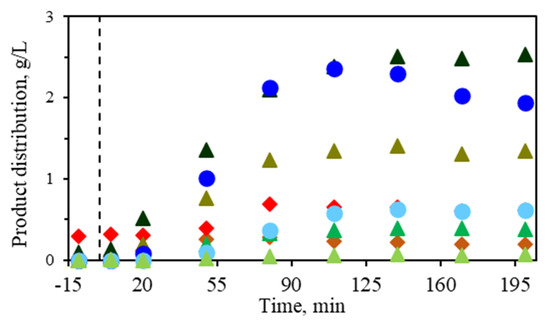 Therefore, high concentrations of Lewis acid promote the degradation of dehydration products and LA formation. In this regard, it is well known that water can rehydrate HMF to form levulinic and formic acids [18]. At low molar catalyst concentrations (5–9 mM), the levulinic acid concentration was low, from 0 to 0.3 g/L. A higher concentration of formic acid was obtained, probably from the degradation of other components present in the reaction medium, such as furfural or xylose, as has been described in the literature [19]. By increasing the catalyst molar concentration, the levulinic acid formation increased, similar to formic acid.