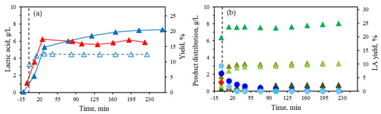 To explore the increased concentration and yield of LA with Al(III), further experiments were conducted using AlCl3 as the sole catalyst, with the Al (III) concentration increased to 32 mM (Figure 5a). However, increasing the Al(III) concentration up to this level did not lead to a higher LA concentration in the medium with the biomass concentration tested in this study, and 16 mM Al (III) was still considered the optimum catalyst concentration. Figure 5a also shows the lactic acid profile obtained with 32 mM of the equimolar mixture Al(III)/Sn(II), equivalent to 16 mM of Al(III), observing lower LA yields. Therefore, it is confirmed that the presence of Sn(II) lowered LA production.
