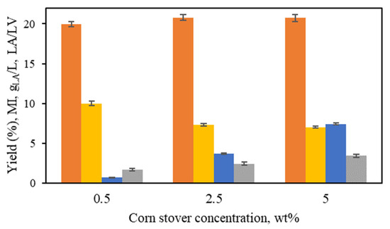 To assess the effect of biomass concentration, two additional biomass loadings were tested besides the 5 wt% previously reported: 0.5 wt% and 2.5 wt%. Experiments were conducted at 190 °C with 16 mM Al(III). Higher biomass concentrations were not attempted due to stirring difficulties, as reported in the study on the alkaline treatment of corn stover to produce LA [12]. During the treatment, the percentage of corn stover that was hydrolyzed was similar across all three biomass loadings, with values of 71%, 69%, and 72% for 0.5 wt%, 2.5 wt%, and 5 wt%, respectively. LA production parameters after 220 min of isothermal treatment at 190 °C are presented in Figure 6. The LA yield showed little variation across the three different biomass loadings tested, in the range from 20 to 21%. However, the LA concentration rose with increasing biomass concentration, reaching 0.7 gLA/L, 3.7 gLA/L, and 7.4 gLA/L at 0.5 wt%, 2.5 wt%, and 5 wt%, respectively. As the LA concentration increased, the molar ratio of lactic acid to levulinic acid (LA/LV) also rose (Figure 6).