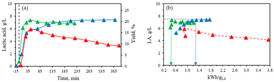 LA is currently produced through chemical synthesis or fermentation, with 90% of industrial LA production currently achieved via biological fermentation [9]. As a drawback, fermentation requires a long operation time (2–8 days), resulting in low productivity. Furthermore, industrial fermentation typically uses hexose sugars or easily hydrolyzable polysaccharides from starch [5], which leads to competition for food resources.
