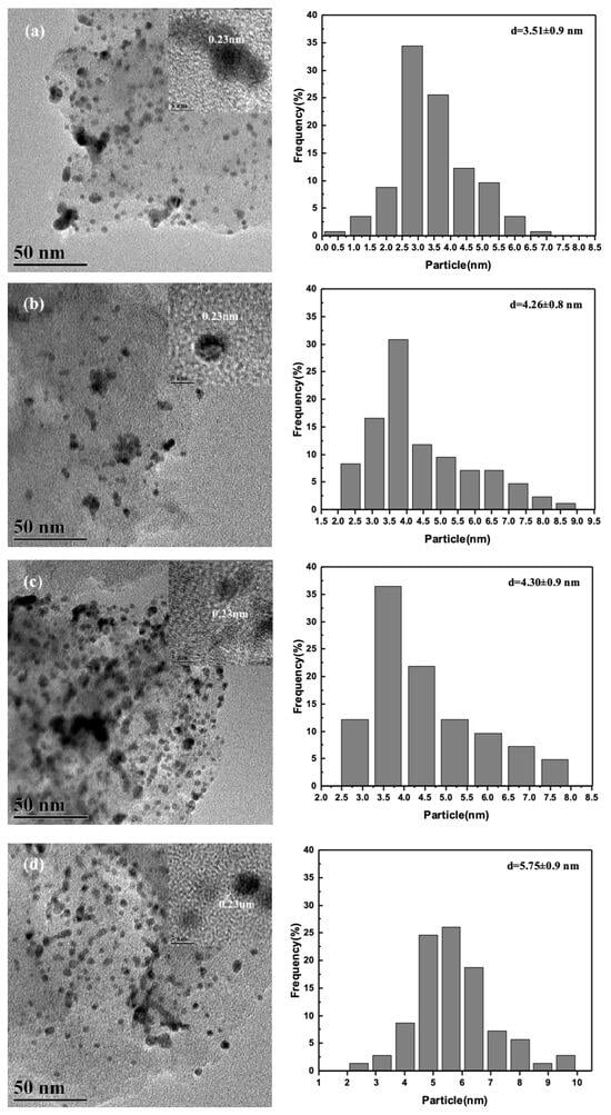 Figure 1 shows the transmission electron microscopy (TEM) images and the particle size distribution (PSD) of the metal NP sizes for PdxAuy/AC-THPC catalysts with different Pd/Au ratios. From the TEM images, it can be observed that small metal NPs were uniformly distributed on the AC support with a narrow PSD. The average NP size of the PdxAuy/AC-THPC catalysts increased gradually with the Pd/Au ratio, from 3.51 nm over Pd1Au1/AC-THPC to 5.75 nm over Pd4Au1/AC-THPC. This may be due to the insufficient amount of THPC added in the preparation of Pd-Au/AC-THPC catalysts with higher Pd/Au ratios, which results in less effective control over the PSD. Nevertheless, notably, the THPC-stabilized NPs supported on Pd-Au/AC-THPC catalysts demonstrated a significantly narrower PSD (±0.9 nm) compared to their ligand-free Pd-Au/Al2O3 counterparts (±2.4 nm), as quantified in Supplementary Figure S1. This disparity in monodispersity highlights the critical influence of THPC coordination chemistry in suppressing nanocristal agglomeration during NP synthesis. Interestingly, by measuring the lattice fringes of the nanoparticles, we can easily observe the Pd (111) lattice fringes with an interplanar spacing of 0.23 nm []. This indicates that in Pd-rich (Pd/Au ≥ 1) Pd-Au/AC-THPC catalysts, the Pd component is still more easily identified, while the elemental distribution of Au requires other methods for detection.