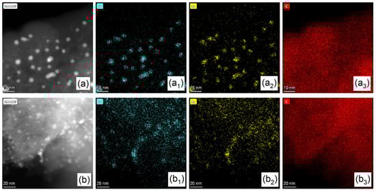 To further characterize the elemental distribution of Pd and Au, as well as the chemical composition of the metal NPs in the Pd-Au/AC-THPC catalyst, aberration-corrected scanning transmission electron microscopy (AC-STEM) and energy dispersive x-ray (EDX) spectroscopy were employed (Figure 2). The EDX mapping images (Figure 2(a1,a2,b1,b2)) and EDX spectra (Figure S2) reveal that the metal NPs were uniformly dispersed on the carbon support, with the elemental distributions of Pd and Au nearly overlapping and both elements being present on each individual NP. This observation directly demonstrates that the THPC method successfully produced uniformly distributed and randomly arranged Pd-Au alloy NPs. In addition, the C signal (Figure 2(a3,b3)) originated from the AC support, while the O signal (Figure S2) can be attributed to oxygen-containing species on the surface of the activated carbon (such as hydroxyl and carboxyl groups) as well as the oxidized state of the metal on the catalyst surface [].