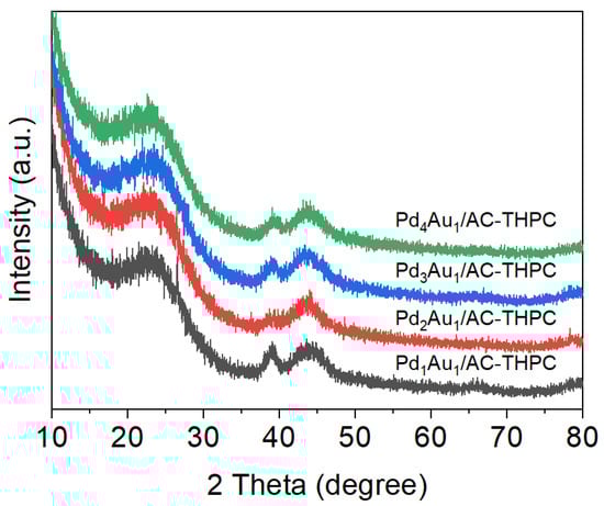 The XRD technique was adopted to investigate the crystalline structure of bimetallic Pd-Au/AC-THPC catalysts with the varied Pd/Au ratios, as shown in Figure 3. The XRD patterns of these catalysts exhibit three main characteristic diffraction peaks located at 2θ = 24.3°, 39°, and 43.3°. The first two peaks correspond to the characteristic reflections of C (002) and C (101), respectively []. The peak at 39° can be attributed to the mixed-metallic components of Pd and Au []. According to the literature, the Pd(111) and Au(111) planes are located at 40.1° and 38.3°, respectively. Furthermore, STEM-EDX images (Figure 2) confirm that Pd and Au coexist within the same NPs. Therefore, the characteristic diffraction peak at 2θ = 39° should be ascribed to the Pd-Au alloy phase, consistent with reported XRD peak positions in the literature [,]. Variations in the intensity of the Pd-Au alloy peak among different catalysts may be related to differences in the sample amount used during testing or the actual metal loading of the catalysts.