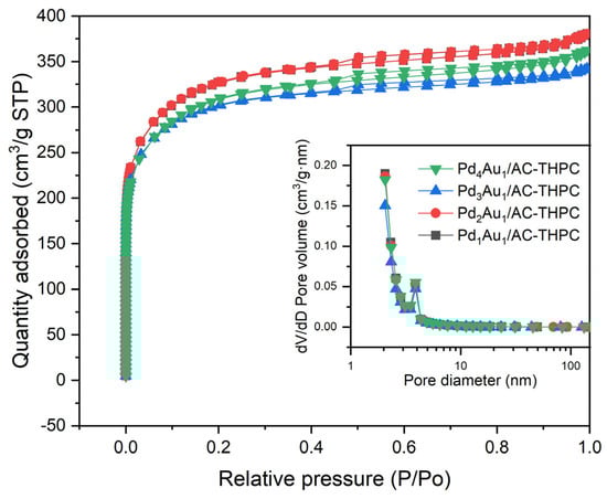 The results for the specific surface area (SSA), pore volume, and pore size distribution of the catalysts are presented in Figure 4 and Table 1. All the synthesized catalysts demonstrated SSAs in the range of 1000–1100 m2/g, suggesting that the Pd/Au ratio has no significant impact on the SSA. At low P/P0 values, the N2 adsorption increased rapidly with an initial rise in P/P0 and then increased more gradually. At higher P/P0 values, the N2 adsorption stabilized, reaching a constant value. This behavior indicated that the nitrogen adsorption of the AC-supported Pd-Au bimetallic catalysts followed a microporous adsorption–desorption isotherm. The strong interactions between nitrogen molecules and the adsorbent in the low-pressure region led to substantial nitrogen adsorption. The pore volume and the average pore size of the catalyst samples exhibited minimal variation, remaining within the range of 0.56–0.58 cm3/g and the range of 3.13–3.18 nm.