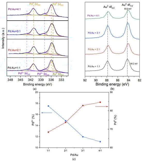 As shown in Figure 5a, the XPS spectrum of each PdAu/AC-THPC catalyst exhibits three characteristic peaks in the Pd 3d region. Taking Pd1Au1/AC-THPC as an example, these peaks are located at 337.9 eV, 335.9 eV and 335.4 eV, corresponding to Pd2+ 3d5/2, Pd0 3d5/2, and Au 4d5/2, respectively. Figure 5c demonstrated a composition-dependent modulation of palladium oxidation states, with the surface Pd2+ fraction decreasing linearly (R2 = 0.94) as the Pd/Au molar ratio increases, while the Pd⁰ content exhibits a proportional rise (R2 = 0.91). This inverse correlation directly correlates with Pd-Au alloy formation, wherein d-orbital hybridization between Pd and Au alters the electron density of Pd orbitals []. Correspondingly, the Au 4f XPS spectra reveal a systematic negative binding energy shift (Δ = 0.1–0.3 eV) in Au0 4f7/2 and Au0 4f5/2 peaks (Figure 5b), consistent with electron transfer from Pd to Au driven by Au’s higher electronegativity []. These parallel trends in Pd and Au electronic states mechanistically confirm alloy-induced interfacial charge redistribution.
