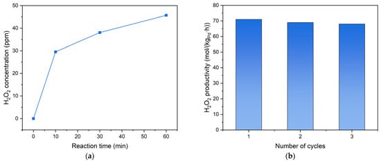 In order to further investigate the catalytic activity and stability of the Pd3Au1/AC-THPC catalyst, additional results were presented in Figure 6. In Figure 6a, a rapid accumulation of H2O2 was observed within the initial 10-min reaction period, demonstrating the catalyst’s superior activation kinetics. Maximum H2O2 selectivity and productivity were attained at 10 min (Table 2), corresponding to optimal surface active-site utilization before competitive degradation pathways became thermodynamically favorable. With the reaction time going, though H2O2 concentration was increasing over time, the H2O2 productivity and selectivity declined due to the high degradation rate, which can be supported by its high excellent reusability with three cycles of reaction running. The high catalyst stability validated the analysis and comparison of catalytic performances.