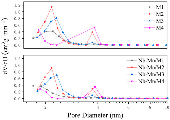 This study investigated the pore structure evolution in MCM-41 molecular sieves with engineered pore sizes and their niobium-manganese oxide-loaded derivatives through nitrogen physisorption analysis. Pore size distribution of supports and catalysts is shown in Figure 1. The MCM-41 series (M1–M4) exhibited a gradual increase in pore diameters from 2.49 to 3.98 nm, validating the achievement of targeted pore size regulation (Table S1). The introduction of metal oxides led to a consistent decrease in pore diameters, ranging from 2.48 to 3.68 nm, which was attributed to the adsorption of Nb-Mn oxide clusters. This decrease was accompanied by a reduction in both specific surface areas and pore volumes, from 1276 to 760 m2g−1 and from 0.761 to 0.725 cm3g−1, respectively.
