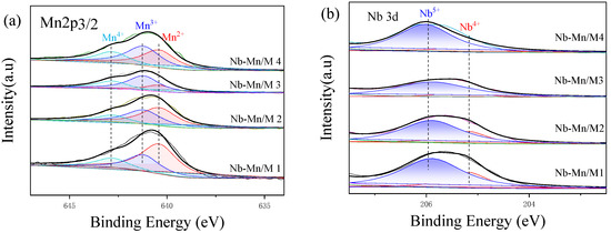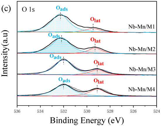 The surface elemental composition and chemical states of the catalysts were meticulously analyzed using XPS, with illustrative spectra for the Mn 2p, Nb 3d, and O 1s regions depicted in Figure 4. Deconvolution of the Mn 2p spectra revealed three distinct oxidation states, with binding energies at 640.4 eV, 641.2 eV, and 642.8 eV corresponding to Mn2+, Mn3+, and Mn4+, respectively [44]. All four catalysts exhibited a coexistence of these manganese valence states (Table 1), likely influenced by the shared isoelectric point of the MCM-41 support. Notably, the Mn4+/(Mn2+ + Mn3+) ratio showed a systematic increase with increasing pore diameter, reaching a maximum of 36.8% in Nb-Mn/M3, indicating enhanced redox properties in the larger-pore catalysts. The Nb 3d spectra presented dual peaks at 205.2 eV (Nb4+) and 206.0 eV (Nb5+), confirming the coexistence of both oxidation states across all catalysts [37,45]. As shown in Table 1, the Nb5+/Nb4+ ratio increased from 2.80 in Nb-Mn/M1 to 5.28 in Nb-Mn/M4, with Nb5+ content rising from 73.7% to 84.1%. This mixed-valent niobium configuration exhibited dual functionality: Nb5+ promoted electron-deficient sites via strong Nb-O bonds. While Nb4+ promoted charge transfer between Mn centers and adsorbed intermediates [46]. Notably, the highest Nb5+/Nb4+ ratio (5.25) in Nb-Mn/M3 coincided with its optimal toluene degradation efficiency (96.8%), suggesting synergistic redox coupling between Nb and Mn. O 1s spectrum analysis identified two oxygen species: adsorbed oxygen (Oad, 530.9 eV) and lattice oxygen (Olat, 529.3 eV). As detailed in Table S2, the Olat/Oad ratio was found to be pore-dependent, with the highest values observed in Nb-Mn/M3 (55.5%). This trend was correlated with the observed Mn4+ enrichment, as higher-valent manganese species are more likely to stabilize lattice oxygen through stronger metal–oxygen bonds [47,48]. Collectively, these findings indicate that while the chemical nature of the supported manganese and niobium oxides is consistent across the pore-modified catalysts, their relative abundance is significantly regulated by the pore architecture [49]. The synergistic interplay between Nb5+-stabilized lattice framework and Mn4+-mediated ROS generation underscores the critical role of dual-metal valency in catalytic oxidation. The increased presence of Mn4+ and Olat in the larger-pore systems (e.g., Nb-Mn/M3) suggests enhanced surface oxygen activation and redox cycling capacity, which are crucial factors influencing catalytic performance in oxidation reactions.