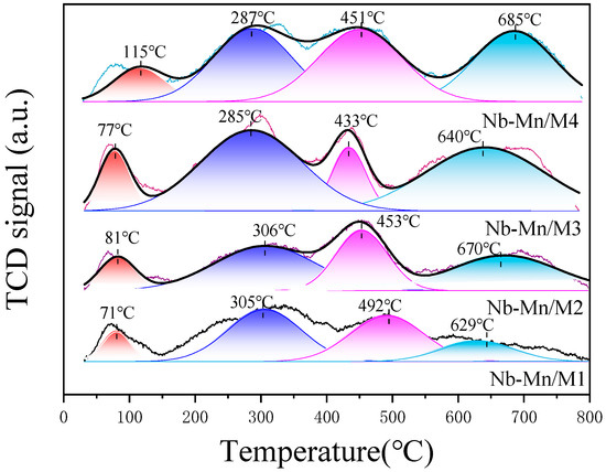 The catalytic properties of the Nb-Mn/M1, Nb-Mn/M2, Nb-Mn/M3, and Nb-Mn/M4 catalysts were characterized through O2-TPD analysis. As depicted in Figure 5, all catalysts exhibited four distinct oxygen desorption peaks. Peak I (71–115 °C) was assigned to molecular oxygen (O2) adsorbed physically on the catalyst surface, while peaks II (285–306 °C) and III (433–492 °C) were attributed to chemisorbed atomic oxygen species. Peak IV (629–685 °C) corresponded to the oxygen in the lattice of the metal oxides [50]. Quantitative analysis of the data presented in Table S2 revealed that Nb-Mn/M3 exhibited the most superior oxygen storage properties, with a total oxygen desorption amount of 0.600 mmol/g, which was approximately 46% higher than that of Nb-Mn/M1. Notably, the lattice oxygen content in Nb-Mn/M3 (0.222 mmol/g) was significantly higher than that of other catalysts. The optimized pore size in Nb-Mn/M3 (3.73 nm) improves the dispersion and accessibility of active sites (Table S1), despite its lower total surface area (981 m2/g) compared to Nb-Mn/M1 (1261 m2/g). This enhanced active site exposure facilitates oxygen adsorption and promotes the uniform distribution of oxygen species, thereby amplifying redox activity and catalytic performance.