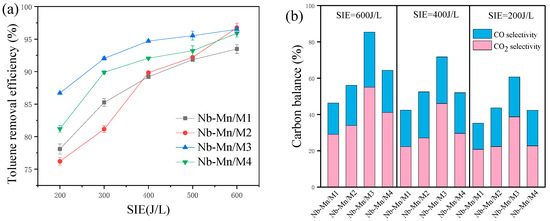 Toluene degradation with different catalysts: (a) toluene removal efficiency; (b) carbon balance and selectivity.