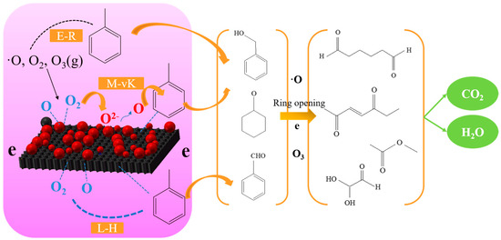 Based on experimental observations and GC-MS analysis (Figure S2), the oxidation mechanism of toluene molecules over bimetallic catalysts was systematically elucidated. As illustrated in Figure 8, three fundamental models govern the plasma-catalytic degradation of toluene: the Mars-van Krevelen (MvK) mechanism, Langmuir–Hinshelwood (LH) mechanism, and Eley–Rideal (ER) mechanism [37,49]. In the MvK mechanism, adsorbed toluene and intermediate products (including benzaldehyde, benzyl alcohol, and hydroxycyclohexane) interact with ROS on the catalyst surface. These species undergo sequential oxidation through intermediates such as adipic acid, heptenedial, carboxypentadiene, and propyl esters, ultimately mineralizing into CO2 and H2O. The Nb-Mn/MCM-41 catalyst facilitates this process through its dual redox couples: the Nb4+/Nb5+ pair functions as a buffering reservoir for oxygen storage and transport, while the Mn3+/Mn4+ pair mediates oxygen transfer to the catalyst surface. While ozone formation in plasma-catalytic systems may compete with reactive oxygen species for active sites, the Nb-Mn/MCM-41 catalyst effectively mitigates this effect through Mn4+-mediated ozone decomposition into reactive O− species and Nb4+/Nb5+ redox stabilization of oxygen species, minimizing gas-phase ozone accumulation while maintaining efficient Olat replenishment. Depleted Olat during toluene oxidation is replenished through ozone decomposition or molecular oxygen capture from the gas phase. The LH mechanism involves surface-adsorbed toluene and intermediates reacting directly with chemisorbed oxygen species, leading to complete oxidation products. The ER mechanism proposes gas-phase interactions between oxygen species and toluene molecules, generating similar intermediates that subsequently undergo mineralization.