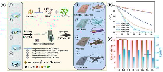 (a) Synthetic strategy of electrodes; (b) SCZ degradation by NZVIF-X (X refers to the pyrolysis temperature); (c) reusability of NZVIF-800 over eight cycles [41].