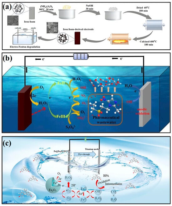 (a) Fabrication process of the iron foam-derived electrode; (b) the HEF reaction mechanism of the iron foam-derived electrode [54]; (c) schematic diagram of the proposed mechanism for the Fe@Fe2O3/ECF electrode [57].