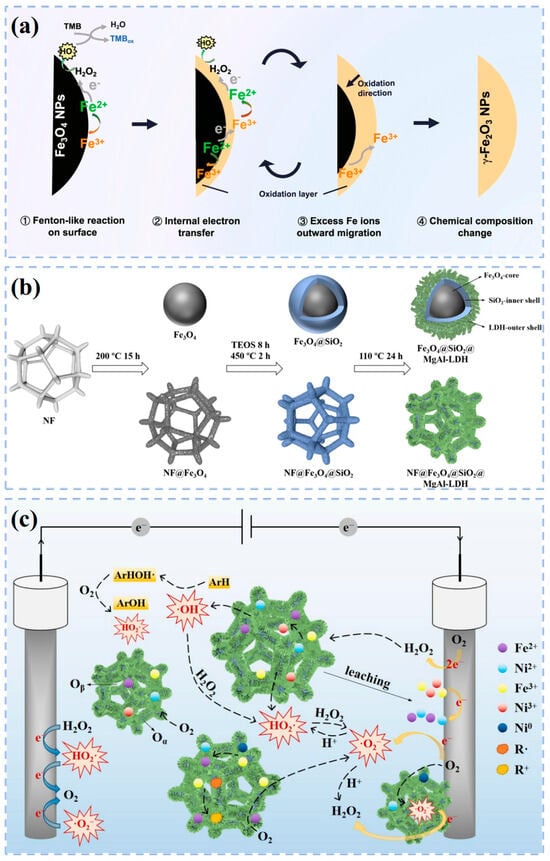 (a) The catalytic mechanism of the peroxidase-like activity of Fe3O4 NPs [63]; (b) schematic diagram of the preparation process of magnetic core-shell composite catalysts; (c) schematic illustration of the enhanced HEF mechanism with NF@Fe3O4@SiO2@MgAl-LDH [64].