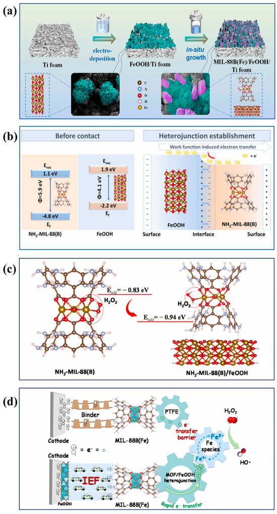 Recent advances have demonstrated the successful integration of iron-MOFs as high-performance HEF catalysts. For instance, Zhu et al. developed a binder-free and self-supported MOF/FeOOH heterojunction cathode specifically designed to enhance Fe(III) reduction [86]. Through an innovative in situ growth strategy, the researchers fabricated an FeOOH layer on titanium foam as both iron source and conductive substrate for subsequent NH2-MIL-88B(Fe) synthesis (Figure 8a). This hierarchical design establishes an internal electron transfer channel that enables direct electron donation to iron centers within the MOF, achieving unprecedented Fe(III) reduction efficiency, and a schematic illustration of the MOF/FeOOH heterojunction is shown in Figure 8b. Complementary DFT calculations and advanced spectroscopic characterization confirmed that the interfacial electric field optimizes electronic structures, promoting directional electron transfer from FeOOH to NH2-MIL-88B(Fe), and the optimized H2O2 and adsorption configuration over the MOF and MOF/FeOOH heterojunction is shown in Figure 8c. Moreover, the heterojunction architecture significantly enhances electron transfer from iron centers to H2O2, thereby amplifying catalytic activity. The possible mechanism of the MOF/FeOOH heterojunction-catalyzed HEF processes is shown in Figure 8d. Further advancing this field, Yang et al. designed a 2D electroresponsive ferrocene MOF (ER-Fc-MOF) electrode capable of direct electron transfer through continuous Fc⁺/Fe(III)-to-Fc/Fe(II) cycling within its sandwich structure [87]. This innovative system demonstrates broad operational versatility, effectively degrading SMX across pH 3–9 even in complex water matrices containing competing ions. Complementing these findings, Pei et al. have elucidated the critical influence of organic ligand engineering on Fe-MOF performance [88]. Through systematic modifications of MIL-101(Fe) ligands, this work demonstrated that tailored electronic properties can precisely modulate iron center electronic states, thereby optimizing H2O2 activation kinetics and •OH generation rates. Notably, electron-donating ligands were found to lower the activation barrier for Fe(III)/Fe(II) cycling, while π-conjugated systems enhance interfacial charge transfer. Collectively, these studies collectively highlight the pivotal role of Fe-MOFs in HEF systems, including the engineered interfaces that facilitate rapid electron transfer through built-in electric fields or redox-active linkers and ligand-mediated tuning of iron electronic states to optimize reactive oxygen species production.