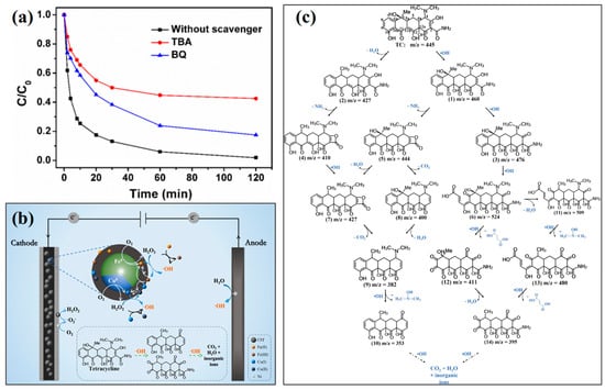(a) TC degradation efficiency during HEF process with or without scavenger addition; (b) schematic diagram of TC removal mechanism; (c) proposed degradation pathway of TC in HEF system with CFF/CNT composite cathode [92].