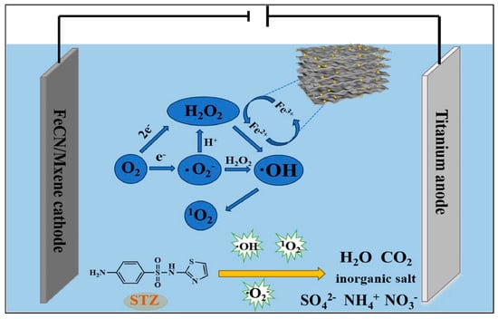 - Liu, H.; Li, Z.; Kong, D.; Chen, X. FeCN/MXene as novel heterogeneous electro-Fenton catalysts for the degradation of sulfathiazole: Performance and mechanism investigation. J. Environ. Sci. 2025, 154, 300–313. [Google Scholar] [CrossRef]