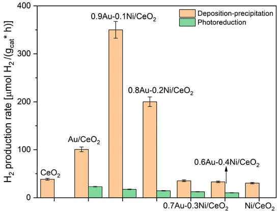 Figure 1 reports the H2 production rates of the investigated photocatalysts. Gold was deposited by the deposition–precipitation method and by photoreduction. As expected, the bare CeO2 showed negligible photocatalytic activity, as well as the 1% Ni/CeO2. On the contrary, the addition of gold boosted up the H2 production due to the activation under simulated solar irradiation of LSPR effects, with the generation of hot electrons that enhanced the H+ reduction to H2, also improving the charge carrier separation [31,32].