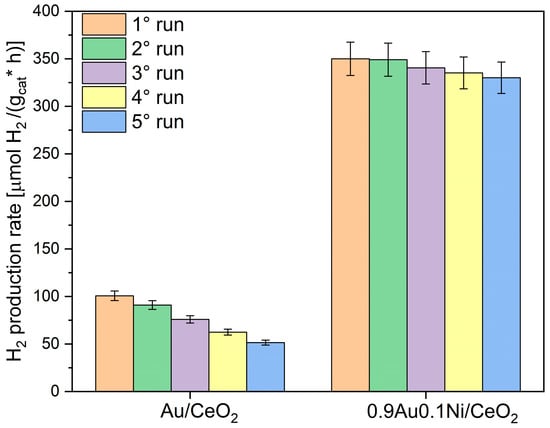 On the highest performing catalyst (0.9Au-0.1Ni/CeO2) and on the monometallic Au sample, the photocatalytic stability after five consecutive runs (Figure 2) was evaluated. Before each run, the samples were centrifugated, dried under vacuum at room temperature, weighted, and re-used without further treatments.