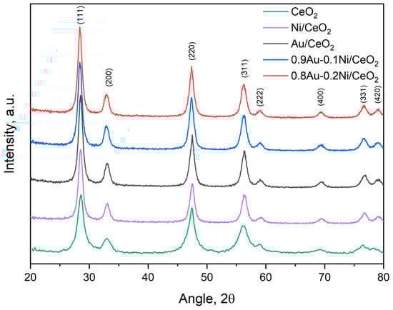 The XRD patterns presented in Figure 3 correspond to the CeO2, Ni/CeO2, Au/CeO2, and bimetallic Au-Ni/CeO2 samples with different Au/Ni ratios. The diffraction peaks of pure CeO2 exhibit characteristic reflections at approximately 28.5°, 33.0°, 47.5°, and 56.3°, corresponding to the fluorite cubic structure of CeO2 (ICSD #24887).