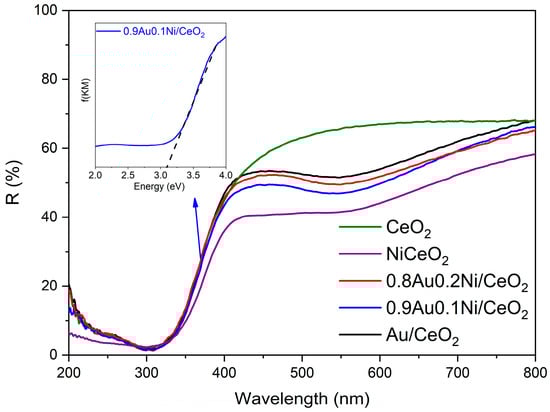 UV-DRS spectra of the investigated photocatalysts (Au added by the deposition–precipitation method). In the inset, the evaluation of the optical band gap by Tauc plot for the 0.9Au-0.1 Ni/CeO2 catalyst is presented as a representative sample.